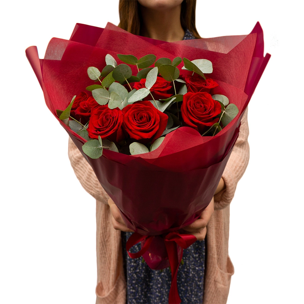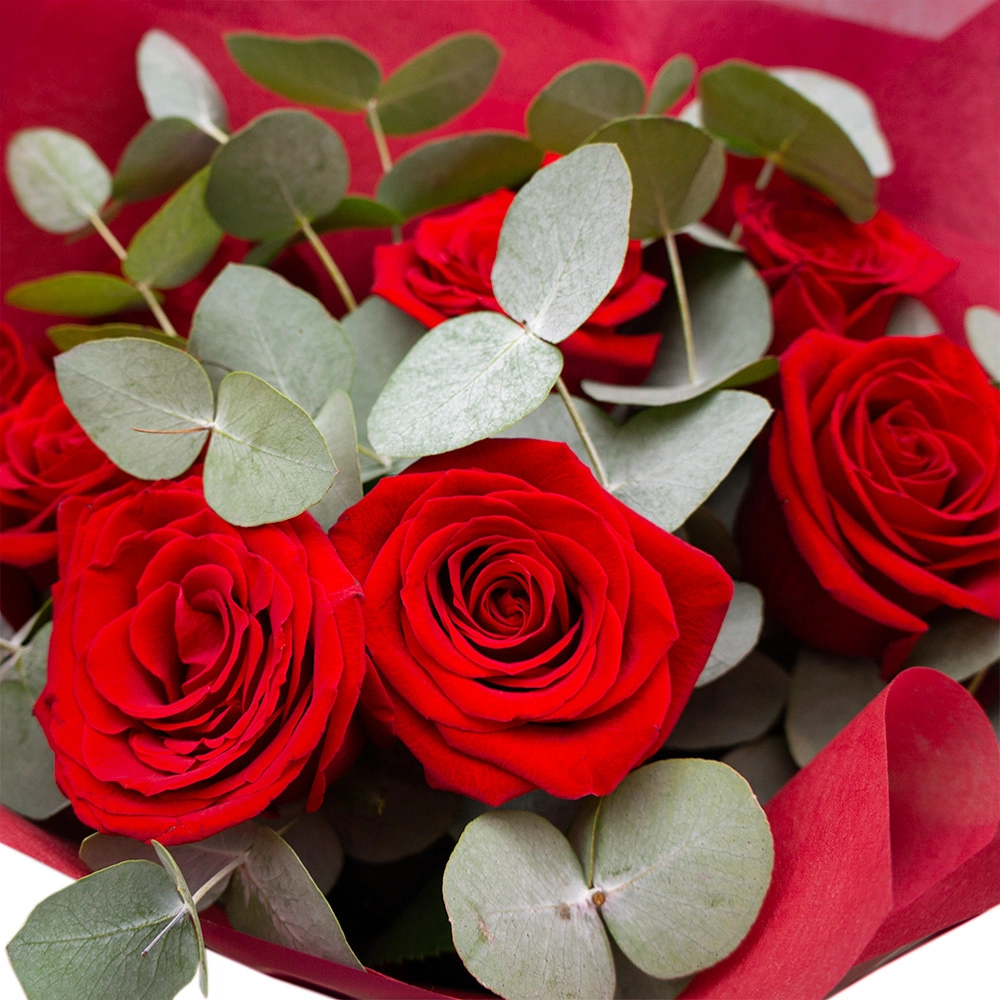 Букет из 9 красных роз с эвкалиптом – классика любви и нежности
